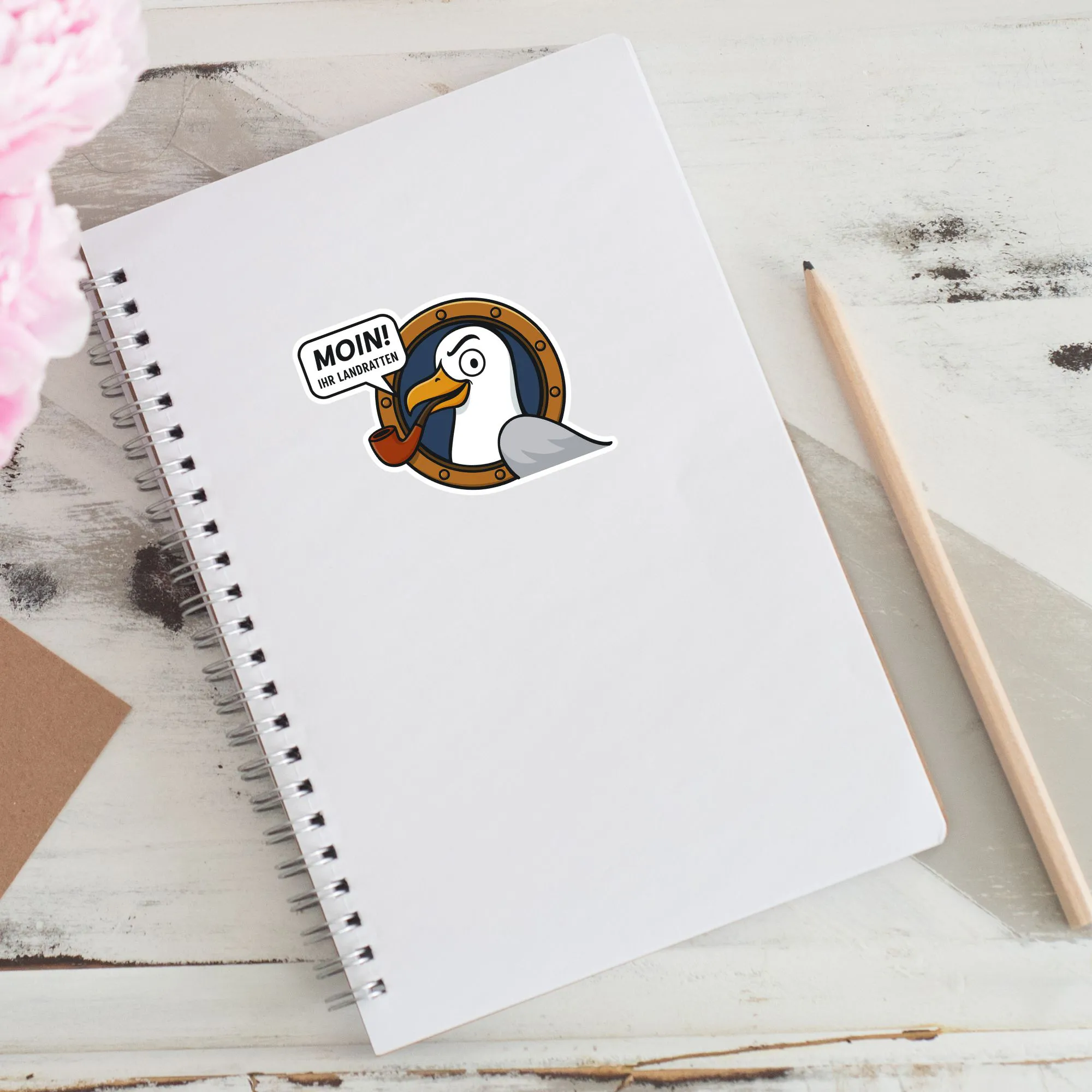 Bringen Sie norddeutschen Humor auf Ihre Gegenstände mit diesem "Moin! Ihr Landratten" Sticker. Das Design zeigt eine grimmig-sympathische Möwe mit Pfeife, die aus einem Bullauge schaut – das ultimative Statement für alle Küstenkinder und Hamburg-Fans.