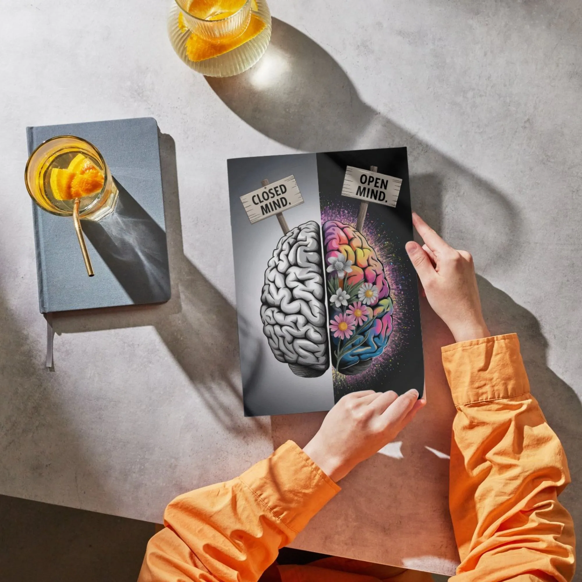 Visualisieren Sie die Kraft der Einstellung mit diesem ausdrucksstarken "Open Mind vs. Closed Mind" Kunstdruck. Das Motiv stellt eindrucksvoll den Kontrast zwischen einem starren, grauen Denkmuster und einem offenen, farbenfrohen Geist dar, aus dem Blumen blühen – ein perfektes Symbol für persönliches Wachstum und lebenslanges Lernen.