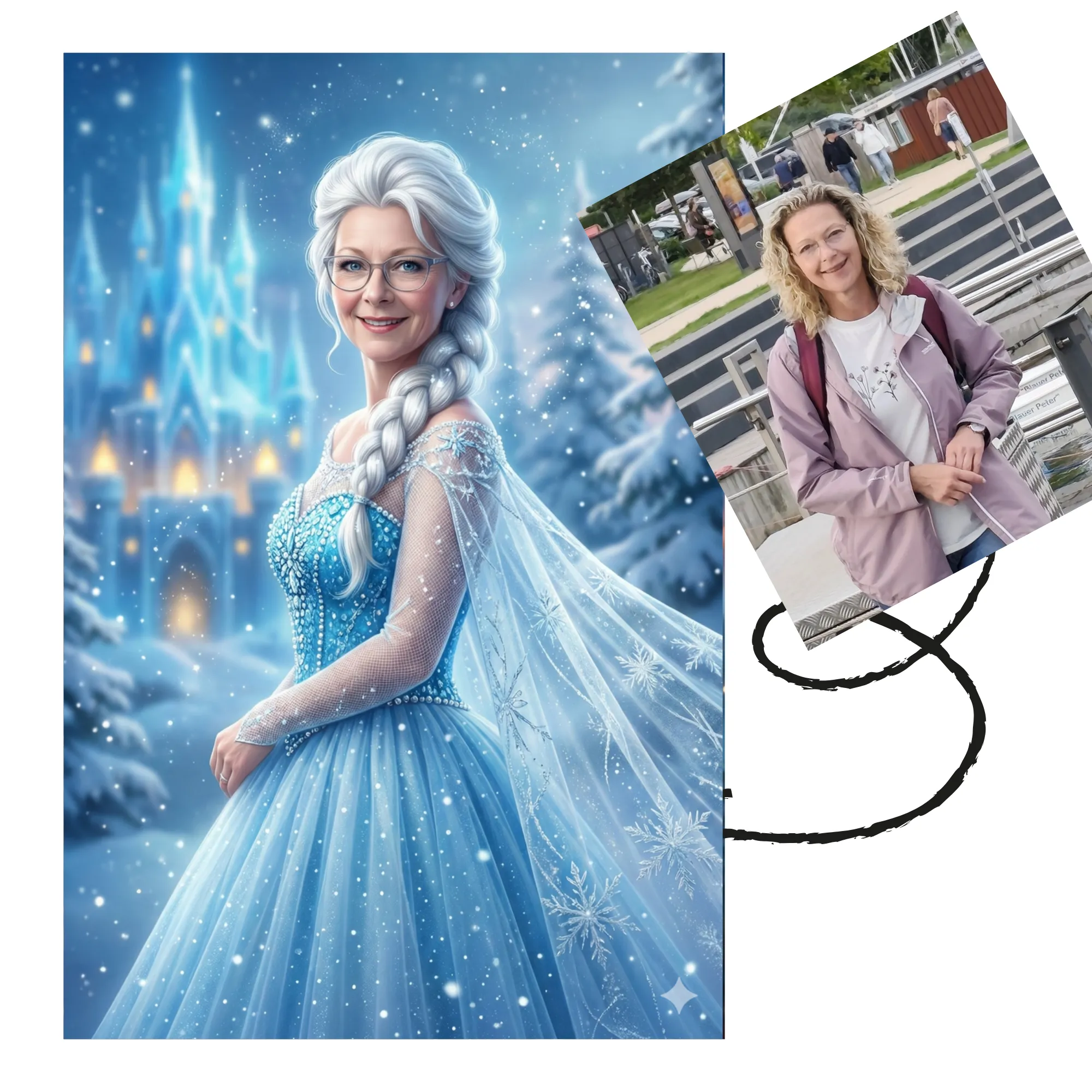 Träumen Sie sich in eine magische Winterwelt! Mit diesem personalisierten Poster verwandeln wir Ihr Foto in ein atemberaubendes Portrait im Stil der Eiskönigin. Wie im Beispiel zu sehen, wird selbst aus einem Alltagsfoto eine majestätische Eis-Regentin vor einem funkelnden Schloss – perfekt auch für Erwachsene, Mütter oder Omas.