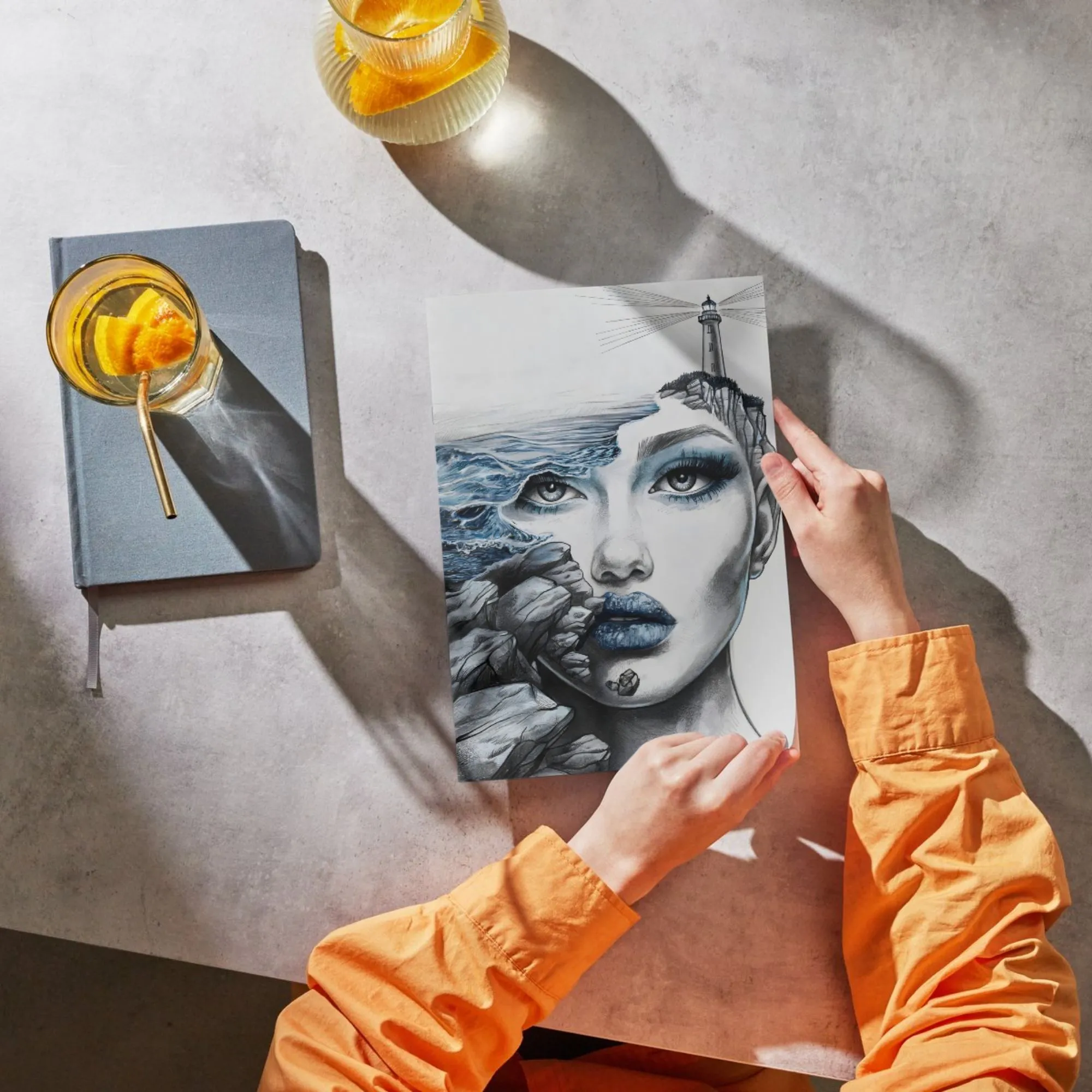 Während ihr intensiver Blick den Betrachter fesselt, verwandelt sich ihre Kontur in schroffe Felsen, auf denen ein einsamer Leuchtturm thront. Wilde Wellen scheinen direkt aus ihren Gedanken zu entspringen. Der Schwarz-Weiß-Look im Skizzen-Stil wird durch leuchtend blaue Akzente an den Augen und Lippen dramatisch durchbrochen.