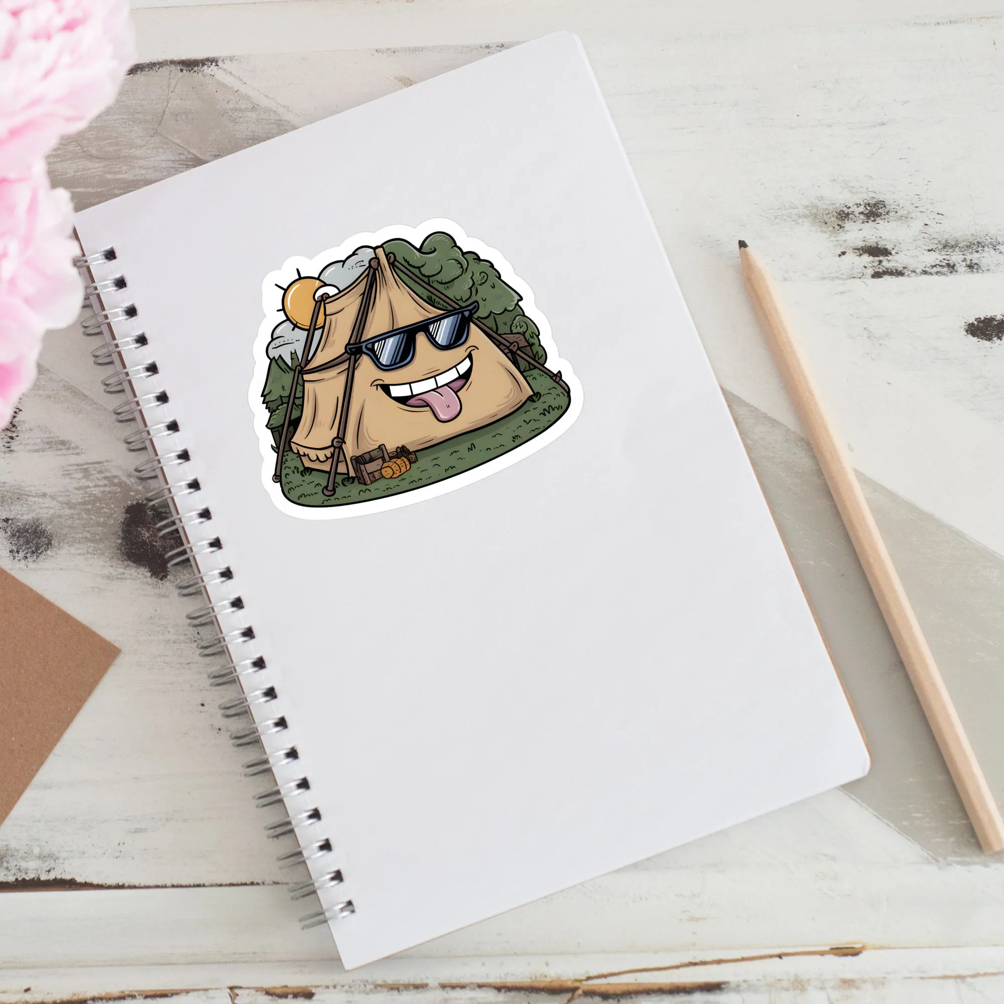 Motiv: Cartoon Zelt mit Gesicht, Sonnenbrille & Waldhintergrund