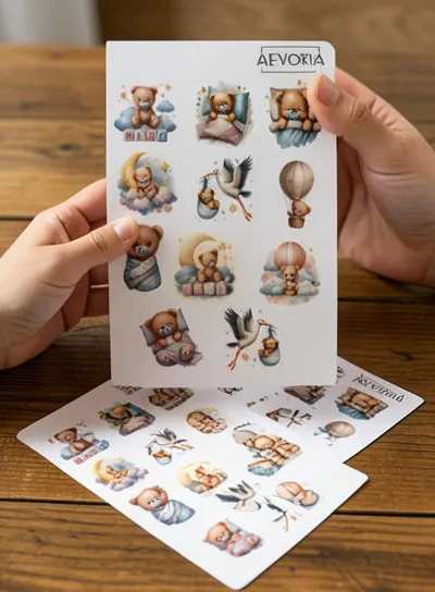 Die Aufkleber bestechen durch ihren wunderschönen Aquarell-Stil (Watercolor). Zu den niedlichen Motiven gehören schlafende Teddybären, ein Storch, der ein Bündel trägt, Teddys im Heißluftballon, auf dem Mond oder zwischen Wolken, sowie "BABY"-Bauklötze. Gedruckt auf hochwertigem Vinyl, sind die Sticker robust, langlebig und haben eine tolle Haptik.