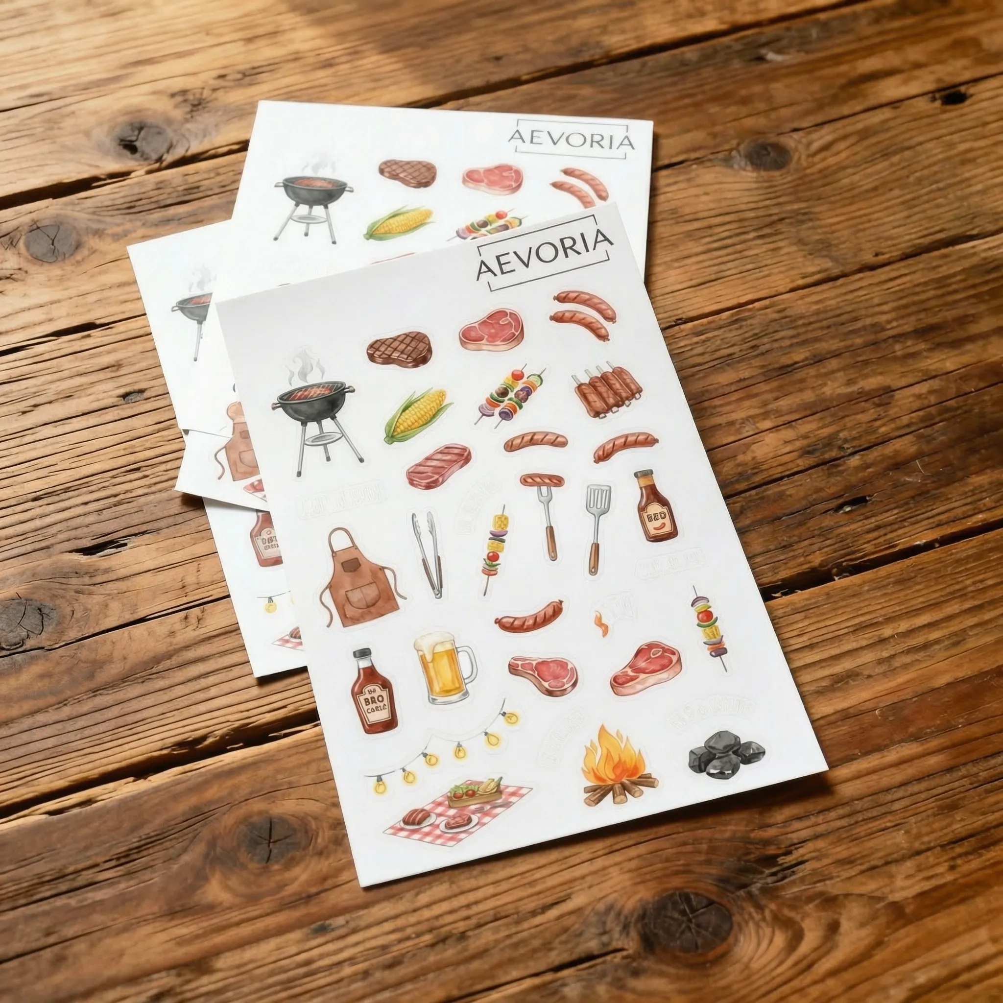 Eröffnen Sie die Grillsaison in Ihrem Kalender mit diesem deftigen BBQ Stickerbogen der Marke AEVORIA. Das perfekte Zubehör für alle Grillmeister, Fleischliebhaber und "Pitmasters", um Grillpartys zu planen, Rezeptbücher zu gestalten oder Einladungen zu verzieren.