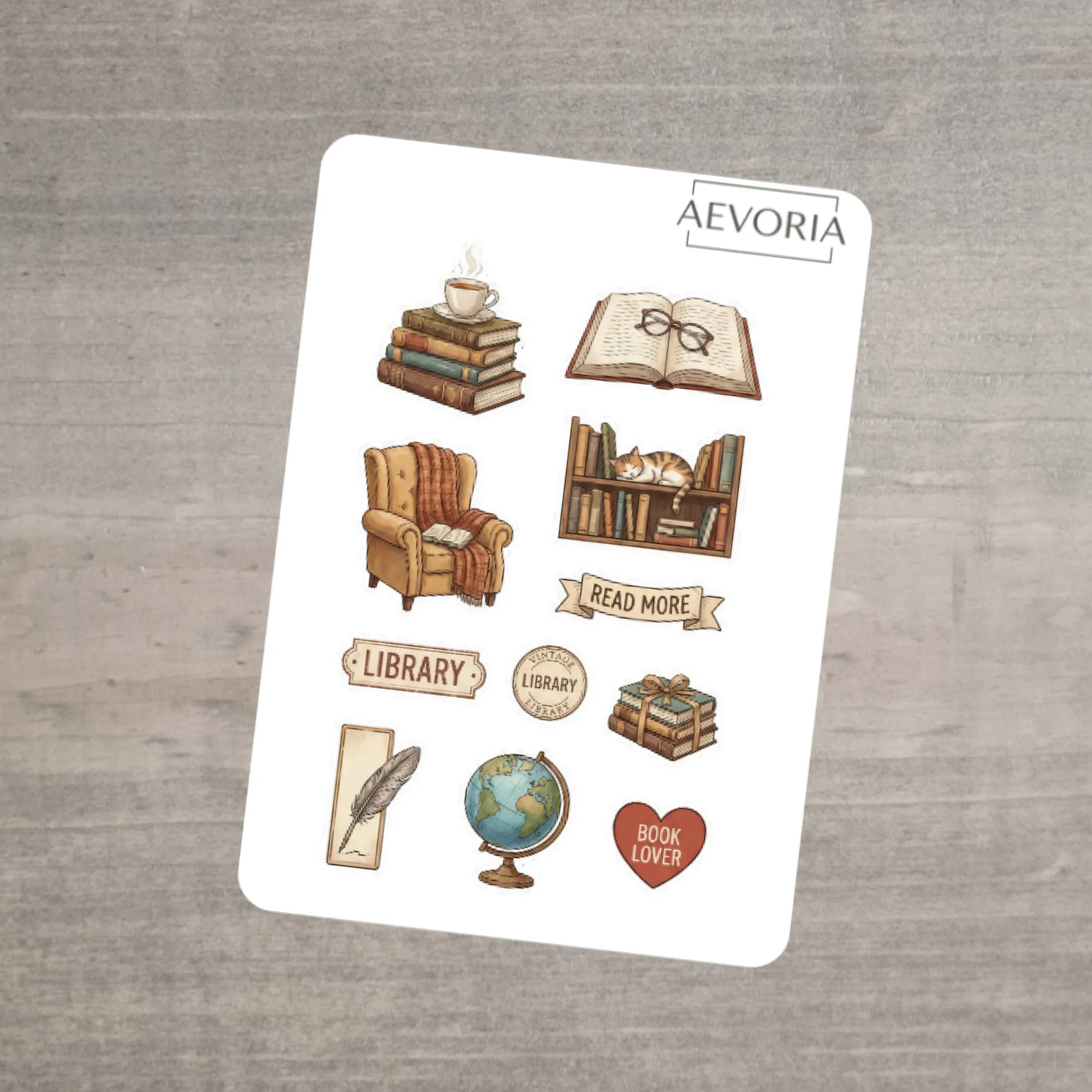 Tauchen Sie ein in die gemütliche Welt der Dark Academia und Bibliotheks-Ästhetik mit diesem handgezeichneten Vinyl Stickerbogen. Perfekt für alle Bücherwürmer, die ihr Bullet Journal, den Reading Planner oder ihren E-Reader (Kindle) verschönern wollen.
