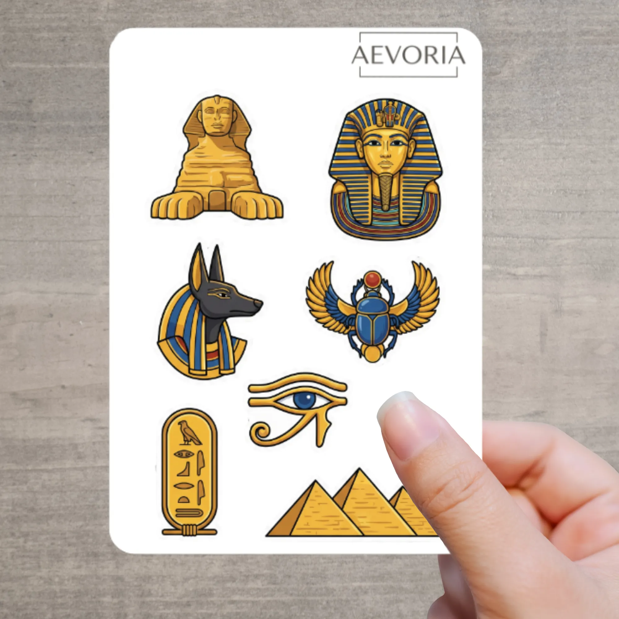 Die Illustrationen sind im klaren, ikonischen Stil gehalten und umfassen: Die große Sphinx, die Totenmaske des Tutanchamun, den Gott Anubis, einen heiligen Skarabäus, das schützende Auge des Horus, die Pyramiden und eine Kartusche mit Hieroglyphen.