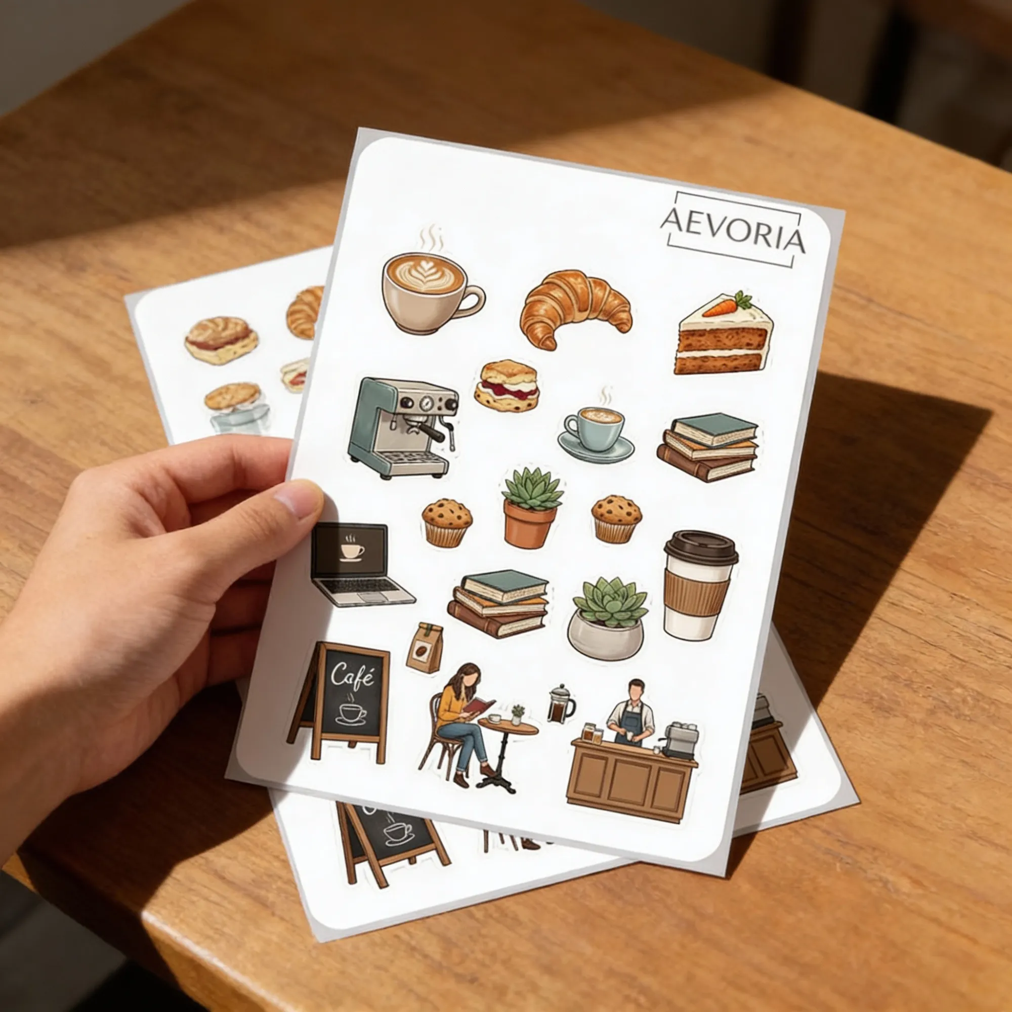 Holen Sie sich die gemütliche Atmosphäre Ihres Lieblingscafés direkt in Ihren Planer mit diesem Kaffee & Bücher Stickerbogen der Marke AEVORIA. Ideal für alle, die das "Coffee Shop" Ambiente, Studygram-Ästhetik und entspannte Lesestunden lieben.