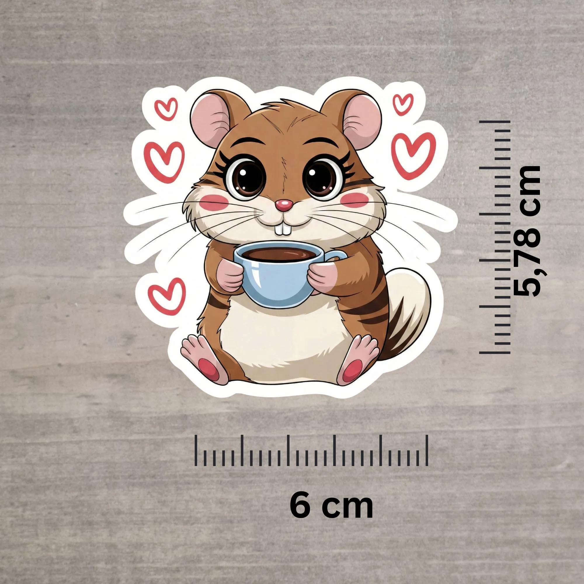 Holen Sie sich diesen entzückenden Hamster-Sticker, der genau weiß, was wichtig ist: Eine große Tasse Kaffee und ganz viel Liebe. Mit seinen großen Kulleraugen und der dampfenden Tasse in den Pfötchen ist dieser Aufkleber der perfekte Stimmungsaufheller für den Alltag.