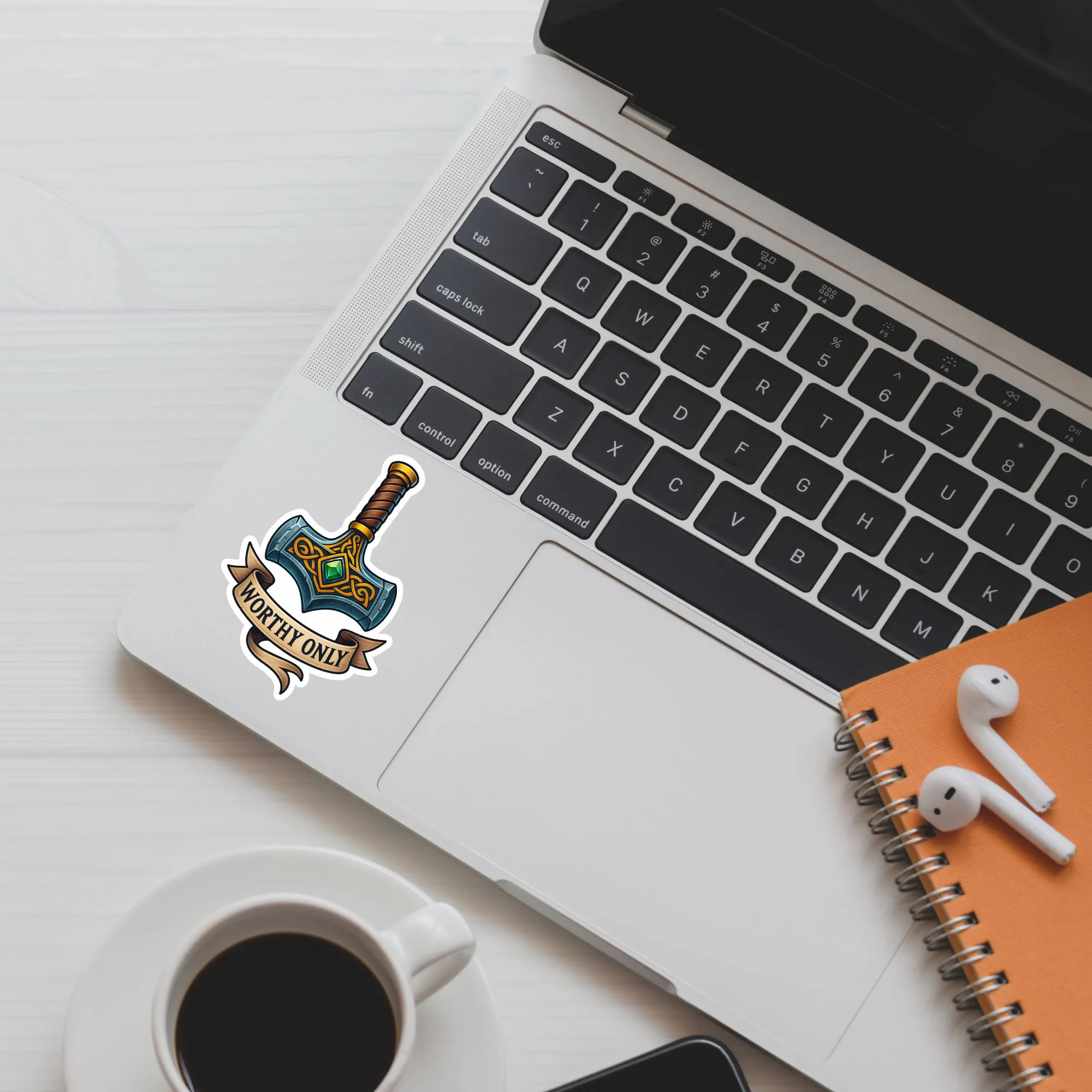 Dieser detailreiche Sticker zeigt einen mächtigen Kriegshammer, inspiriert von nordischen Legenden und modernen Superhelden-Mythen. Verziert mit goldenen keltischen Knoten, einem grünen Edelstein und dem Schriftzug-Banner "WORTHY ONE", ist dieser Aufkleber die ultimative Auszeichnung für jeden Alltagshelden.