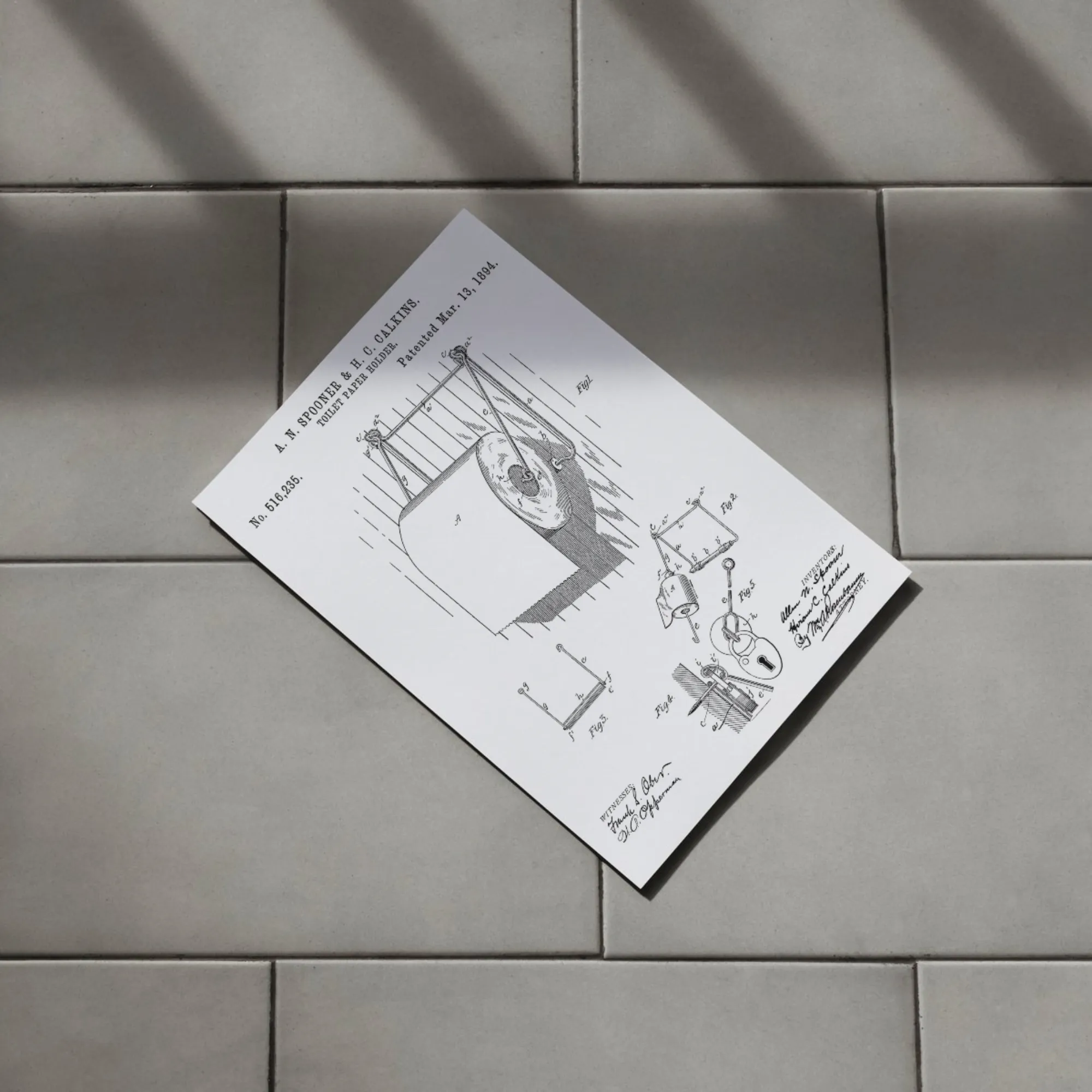 Verleihen Sie Ihrem Badezimmer einen Hauch von industrieller Geschichte mit diesem detaillierten Patentdruck von 1894. Die technische Zeichnung von A. N. Spooner & H. C. Calkins zeigt den klassischen Toilettenpapierhalter in seiner ursprünglichen Konzeption (Patent No. 516,235).