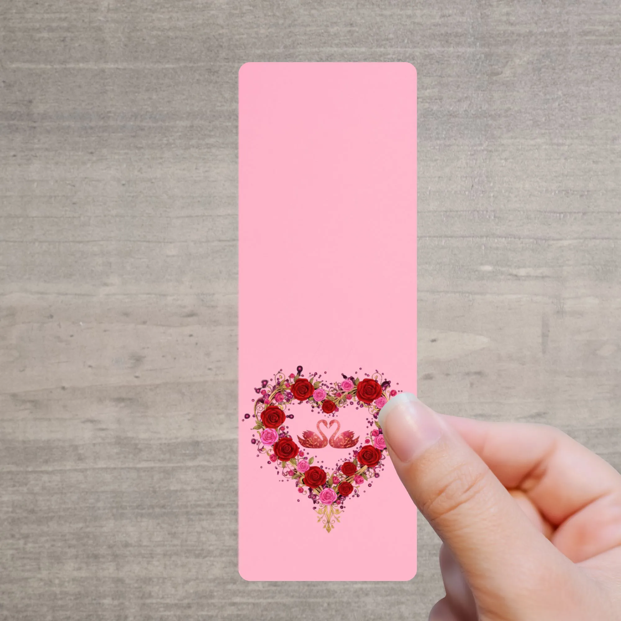 Zeigen Sie Ihre Zuneigung mit jedem Umblättern! Dieses romantische Lesezeichen ist das ideale Geschenk für die Liebste oder einen besonderen Menschen. Das Design zeigt ein kunstvolles Herz, geformt aus roten und pinken Rosen mit goldenen Akzenten, das zwei sich zugewandte Schwäne auf einem zartrosa Hintergrund einrahmt.