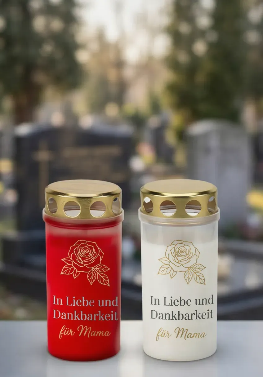 Sagen Sie "Danke" auf eine besonders würdevolle Weise. Mit diesem 4er Set transparenter Aufkleber verwandeln Sie herkömmliche Grablichter in ein persönliches Zeichen der Erinnerung an Ihre Mutter.