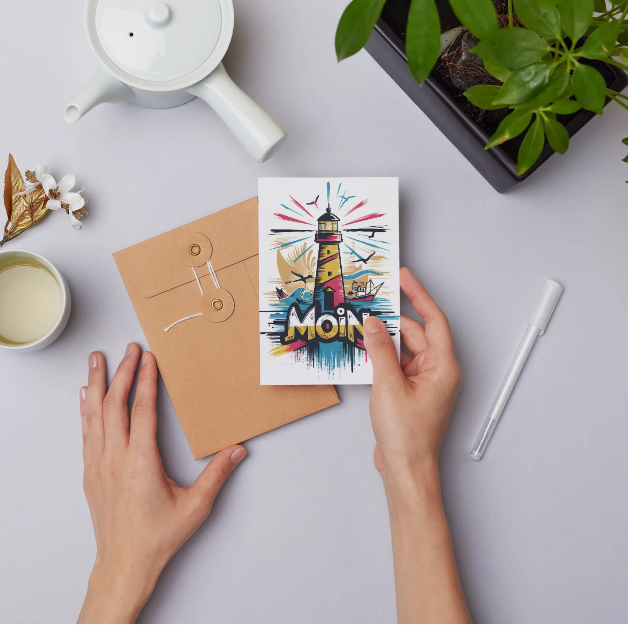 Versenden Sie sonnige Grüße von der Küste mit dieser farbenfrohen "Moin" Postkarte. Das Design besticht durch eine dynamische, comic-artige Illustration eines klassischen Leuchtturms, umgeben von Möwen und einem Fischkutter, untermalt von strahlenden Farbverläufen.