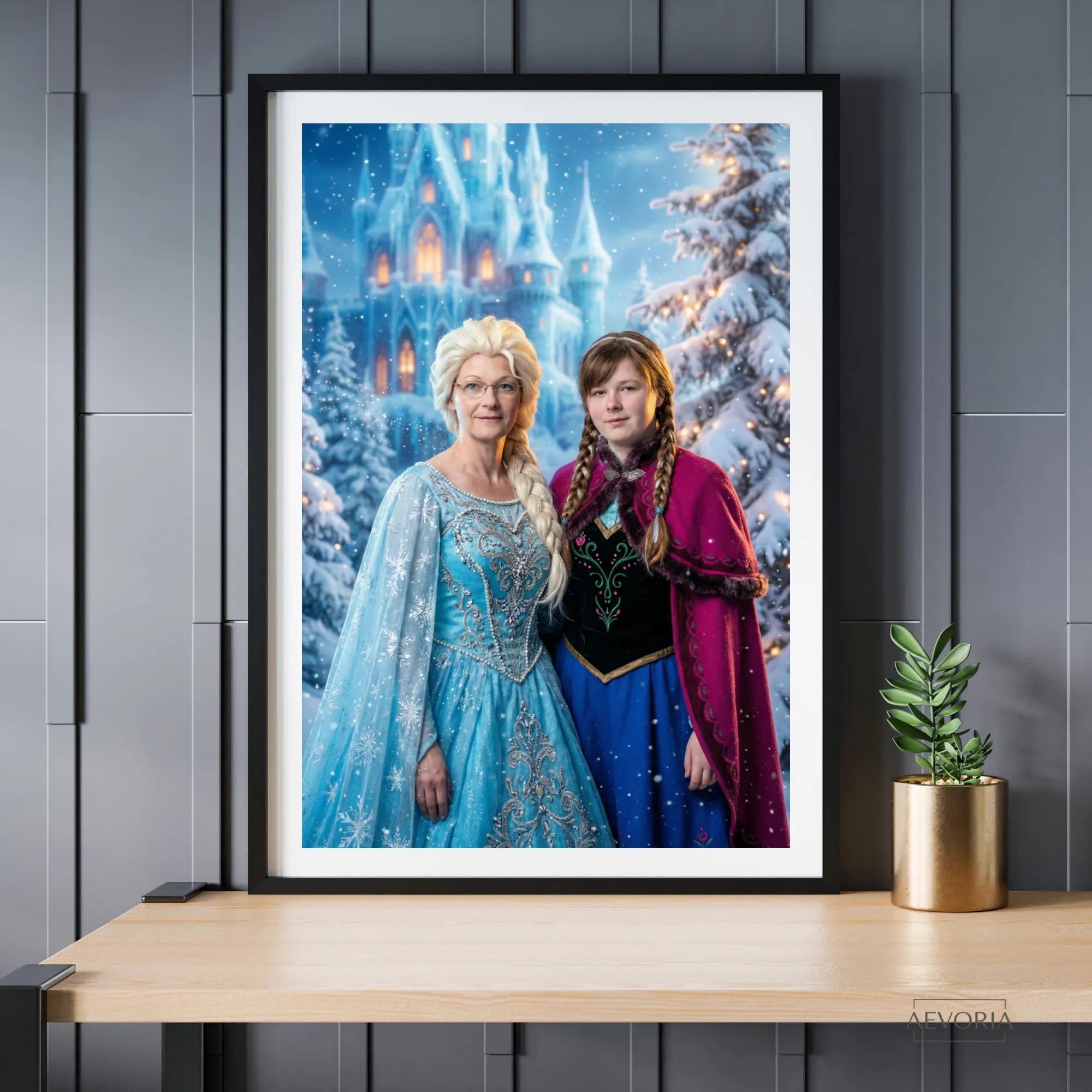 Ob als mutige Schwester, Eisprinzessin oder Königin – wir integrieren Ihre Gesichter nahtlos in eine zauberhafte Winterwelt. Gedruckt auf 200g Premium Fotopapier mit Satin-Finish, wirkt das Ergebnis gestochen scharf, farbintensiv und edel schimmernd.