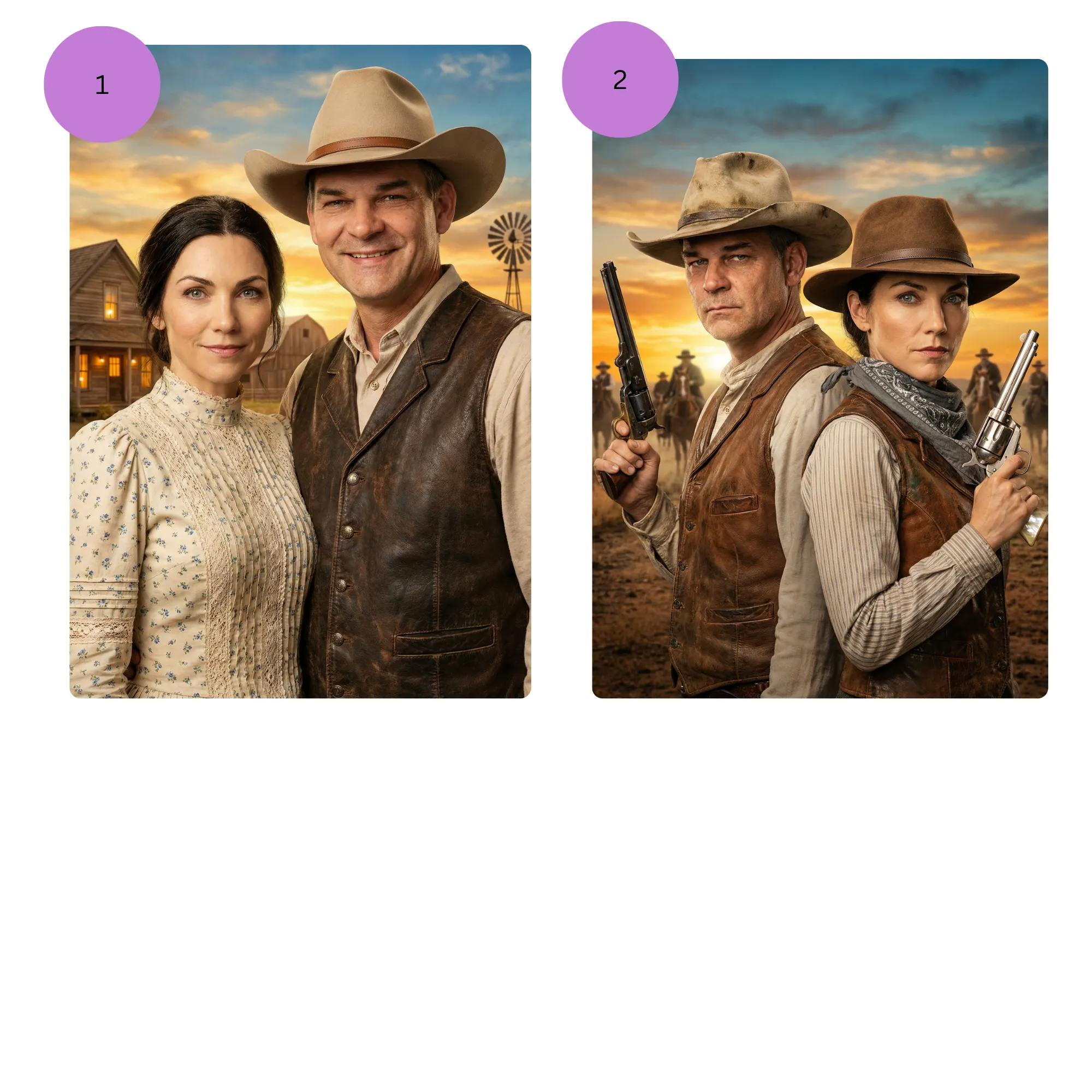Ob als romantisches Siedler-Paar oder als verwegene Revolverhelden – wir integrieren Ihre Gesichter täuschend echt in die Szenerie.