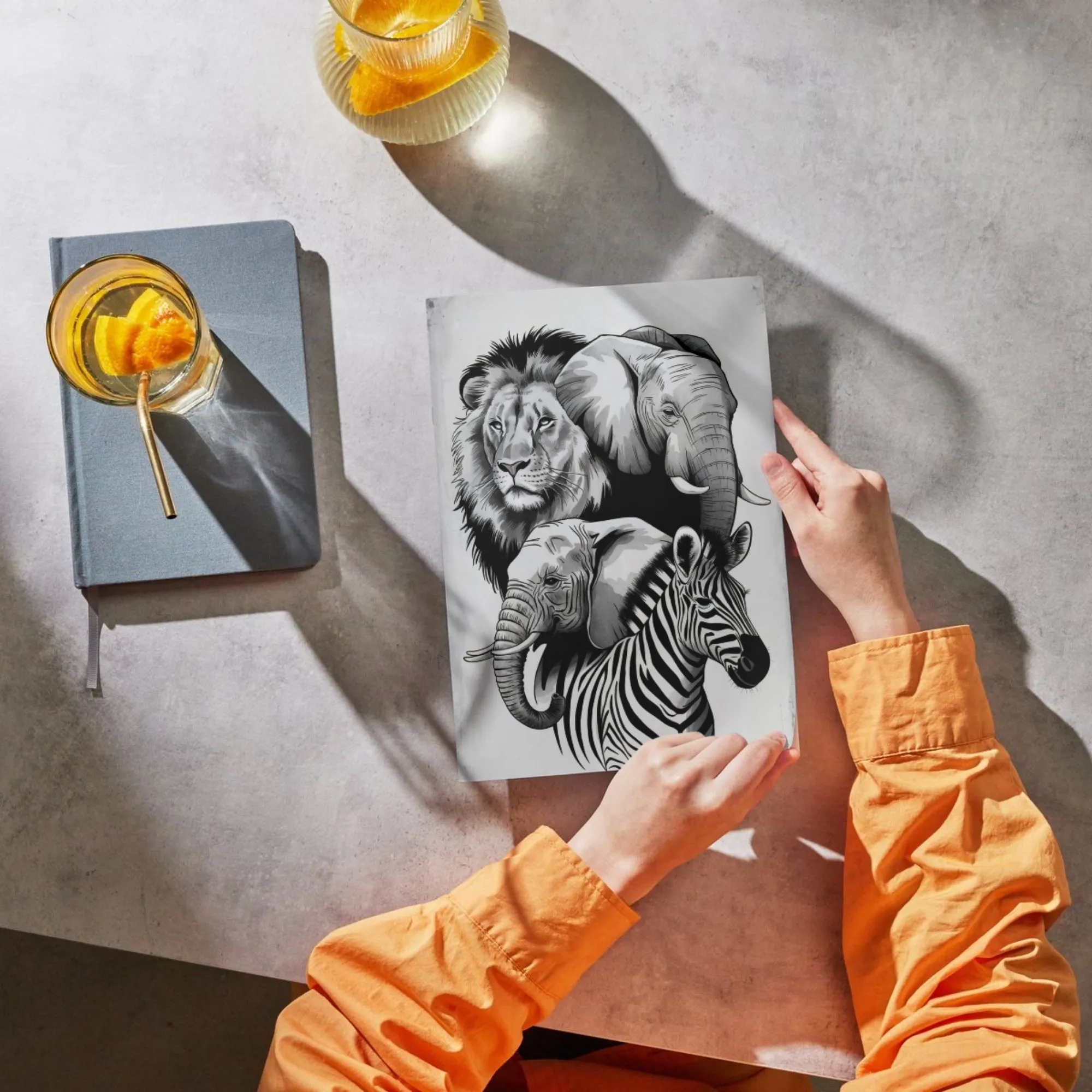 Holen Sie sich die wilde Schönheit Afrikas nach Hause. Diese kunstvolle Collage vereint die Ikonen der Savanne in einem Bild. Die realistische Schwarz-Weiß-Illustration zeigt einen majestätischen Löwen, sanfte Elefanten und ein Zebra in harmonischer Komposition – ein Muss für jeden Naturliebhaber.