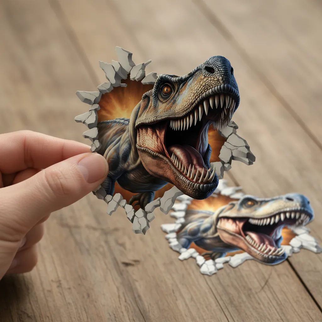 Holen Sie sich die Urzeit direkt ins Kinderzimmer mit diesem spektakulären 3D Dinosaurier Sticker. Das Motiv erzeugt eine optische Täuschung (Trompe-l’œil): Es sieht so aus, als würden zwei furchterregende T-Rex Köpfe gerade durch die Wand (oder den Untergrund) brechen.