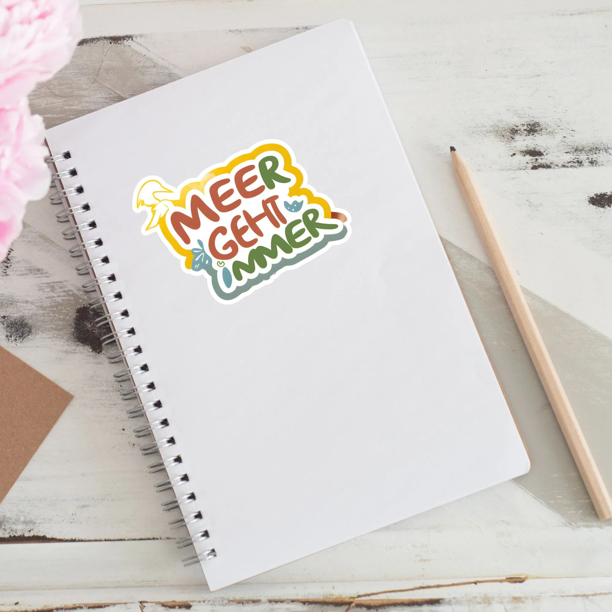 Bekennen Sie Farbe zu Ihrer großen Liebe, dem Meer, mit diesem fröhlichen "Meer geht immer" Sticker. Im Gegensatz zu klassischen maritimen Motiven besticht dieser Aufkleber durch sein modernes, verspieltes Typografie-Design in warmen Farben (Rostrot, Grün, Blau, Gelb).