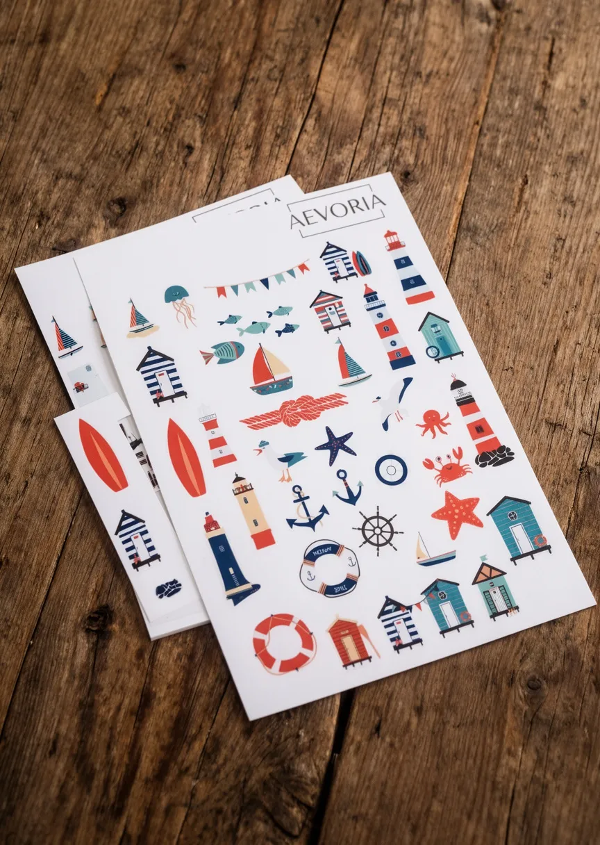 Holen Sie sich das unbeschwerte Strandgefühl nach Hause mit diesem farbenfrohen Maritimen Stickerbogen der Marke AEVORIA. Dieses Set versprüht echtes Nordsee- und Ostsee-Feeling und ist ideal für Travel Journals, Urlaubstagebücher oder maritime Dekorationen im Badezimmer.