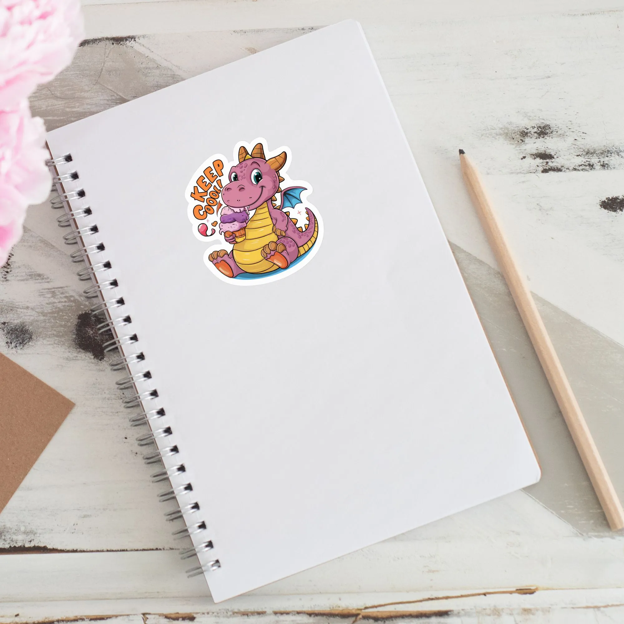 Dieser zuckersüße Drachen-Sticker mit dem Motto "KEEP COOL!" ist die perfekte Erinnerung daran, das Leben entspannt zu genießen. Der kleine lila Drache lässt es sich mit einer riesigen Kugel Eiscreme gut gehen und bringt sofort Sommer-Vibes auf deine Gegenstände.